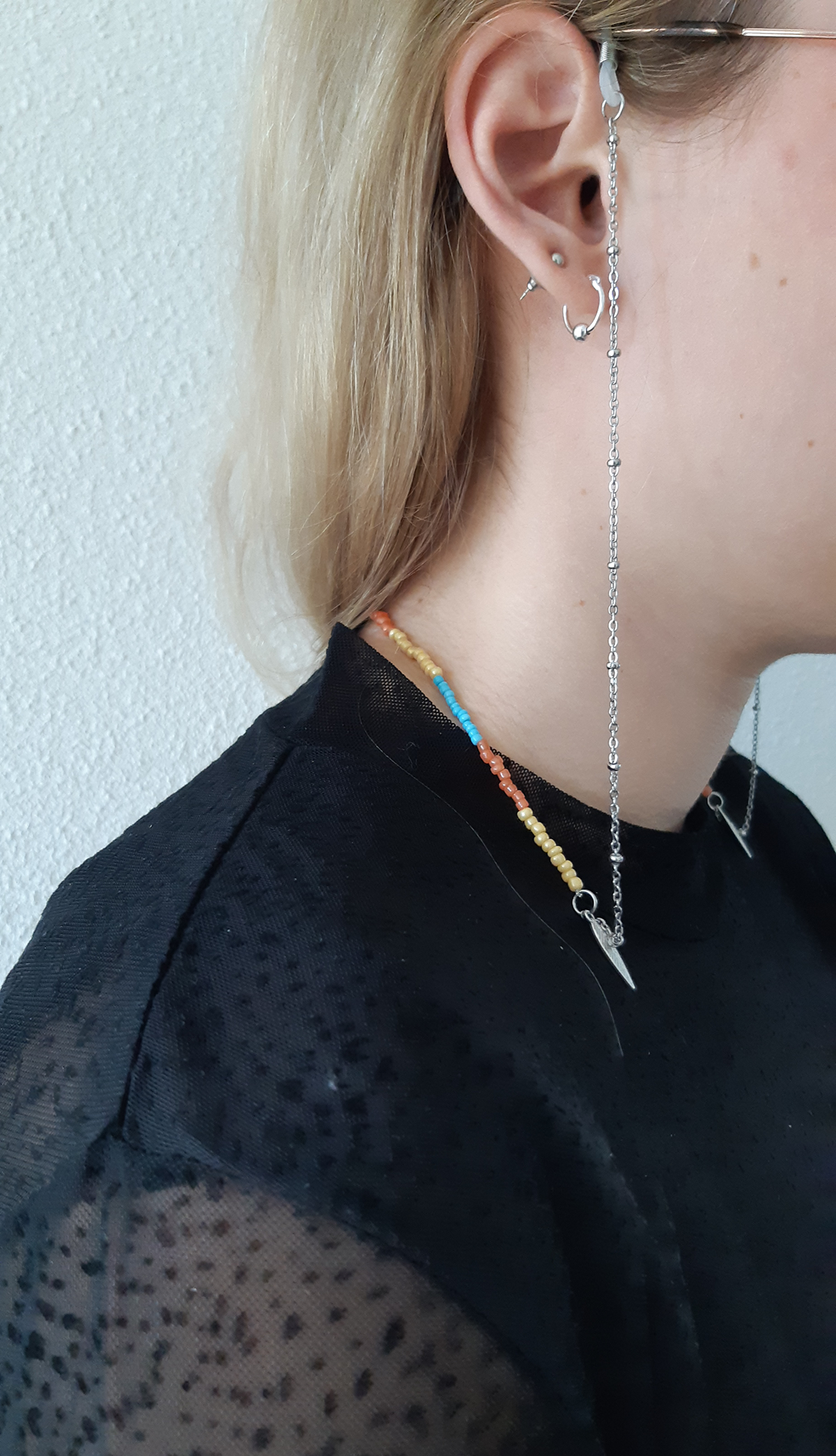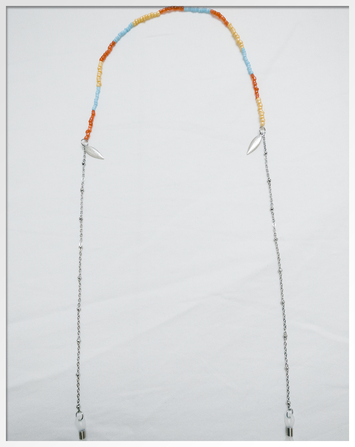 Het koord is gemaakt van jasseron ketting met bolletjes. Verder is er een nylon draad aan vast gemaakt waaraan een mix aan rocailles kralen zijn geregen. Deze kralen hebben 4 verschillende kleuren (Champange Gold Metallic, blauw, oranje en zwart) en hebben verschillende maten (2, 3 en 4 millimeter groot) voor een speels effect. Verder hebben we 2 bedels van DQ metaal bevestigd in de vorm van veertjes.