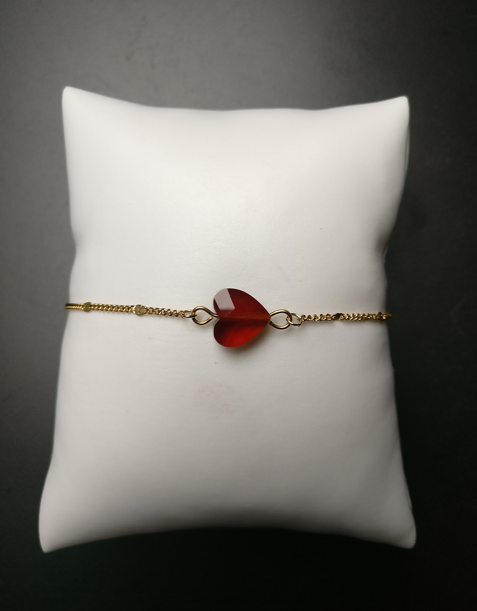 Deze luxe schakelarmband is gemaakt van een 2mm dikke jasseron ketting van RVS. De armband wordt op een aantal punten onderbroken waardoor je een leuk effect krijgt. In het midden van de armband hebben wij een rode smoked topaz kraal bevestigd doormiddel van een goudkleurige kettelstift. Verder hebben wij gekozen voor een goudkleurige verlengketting. Hierdoor is de armband in lengte verstelbaar.