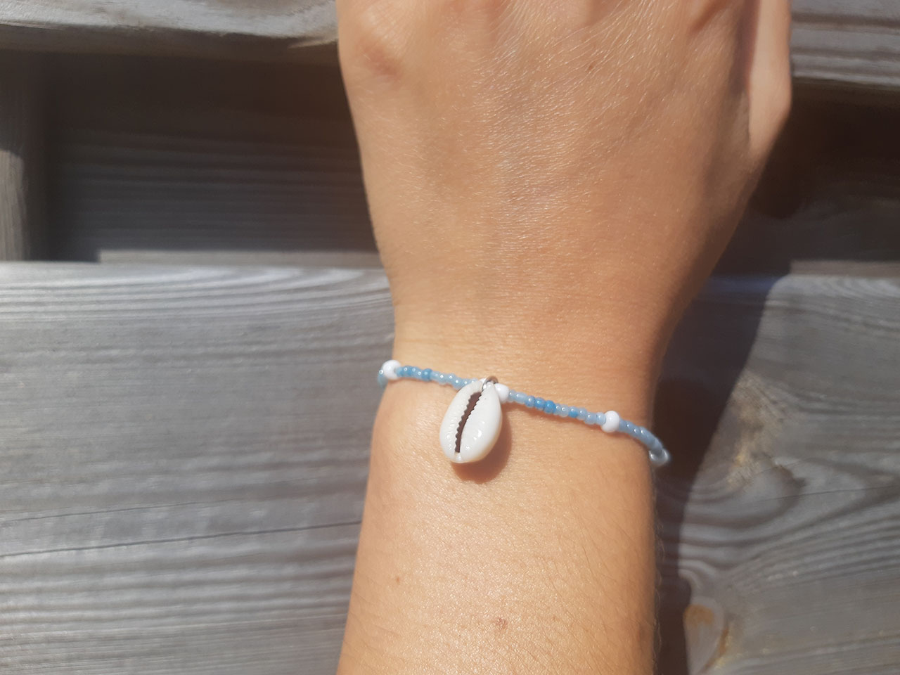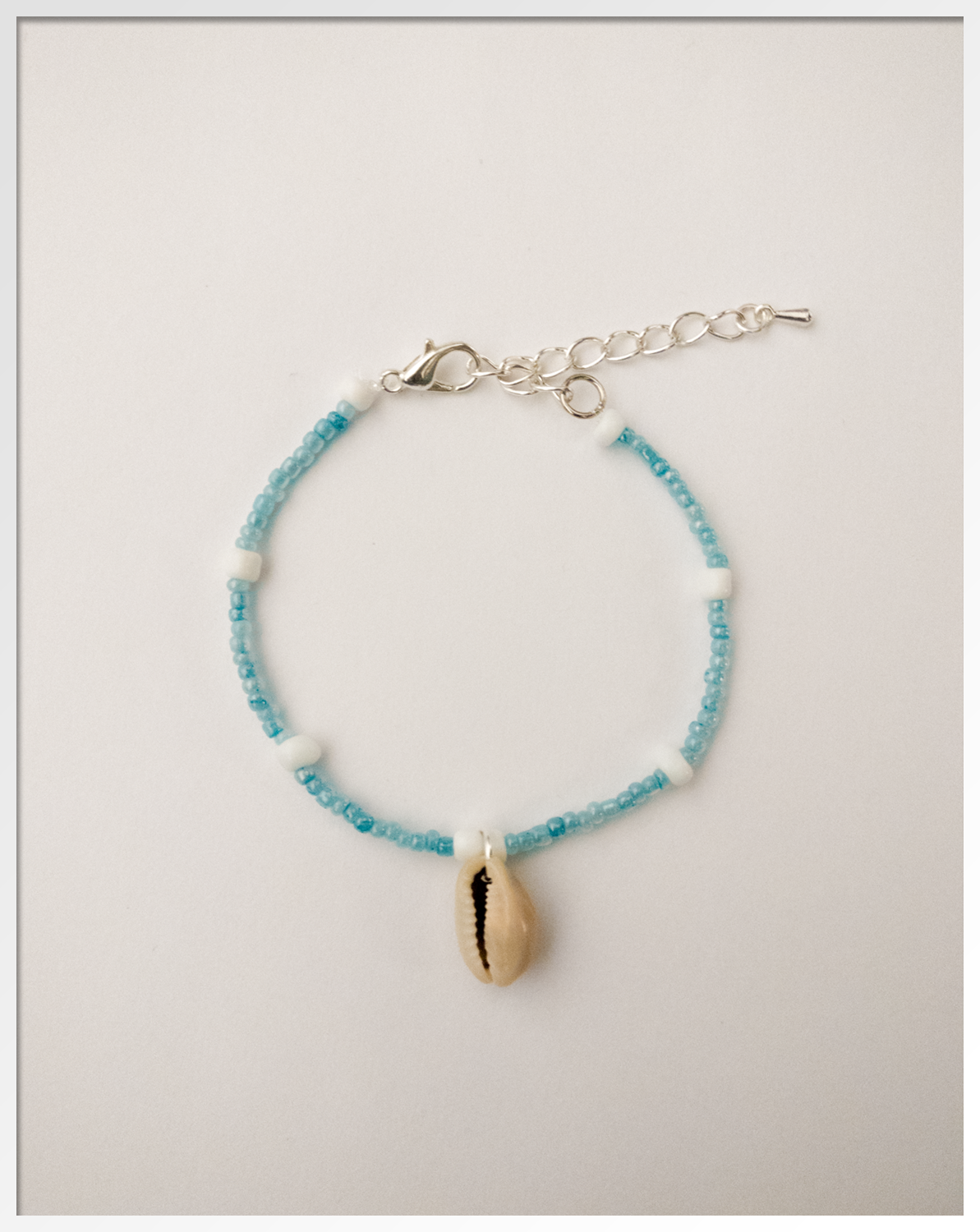 Deze unieke armband is gemaakt van roccailles kralen. De kralen zijn 2mm groot en in de kleur sky blue. Deze zijn geregen op nylon draad. Ook zijn er 4mm witte roccailles kralen gebruikt.