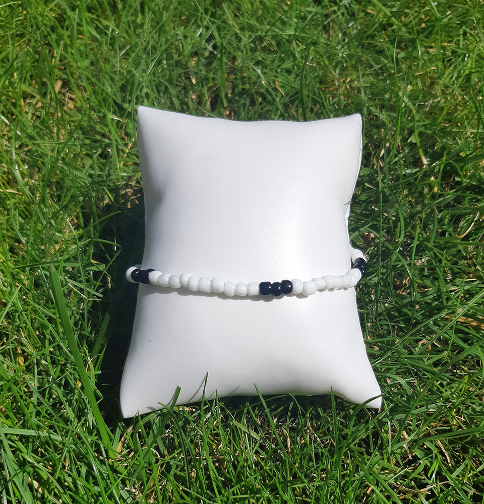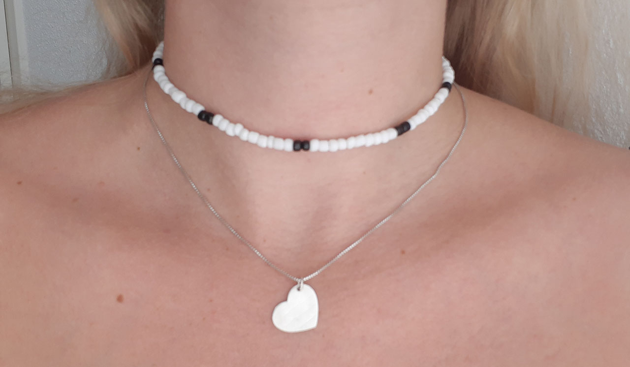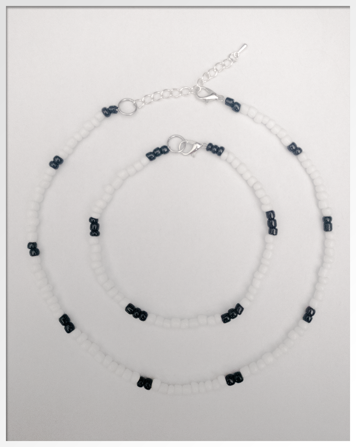 De sieraden zijn beide gemaakt van zwart en witte rocailles kralen. De kralen zijn 4mm groot. De choker is geregen op nylon draad terwijl de enkelband is geregen op elastisch draad.
